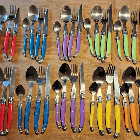 Sæt bestående af knive og gafler med håndtag i træ og metal. Bestikket er velegnet til almindelig borddækning og måltider. Materialerne kombinerer træ og metal for et klassisk udseende. De er af mærket Lagouile.
