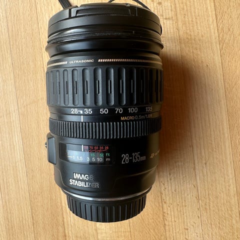 Canon EF 28-135mm f/3.5-5.6 IS USM objektiv med billedstabilisering. Objektivet har en zoomafstand på 28-135mm og er designet til Canon kameraer med EF-fatning.