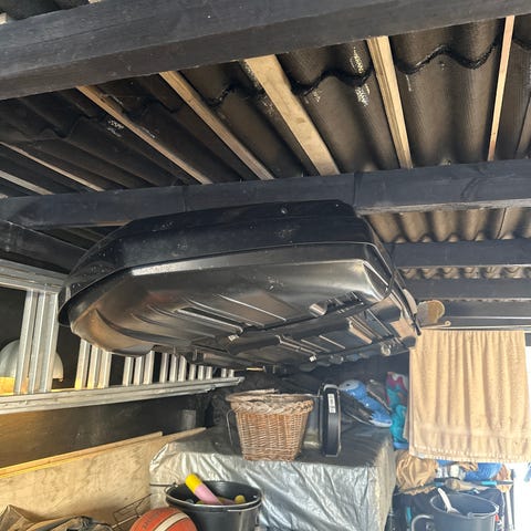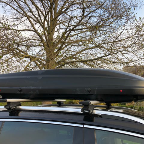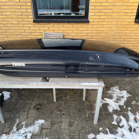 Thule tagboks i grå farve. 230x90 cm. Perfekt til ski og masser af skiudstyr. Tagboksen kan åbnes fra begge sider. Låsen virker desværre ikke længere, så skal enten skiftes eller gør brug af alternativ lås som vi har gjort seneste par år.