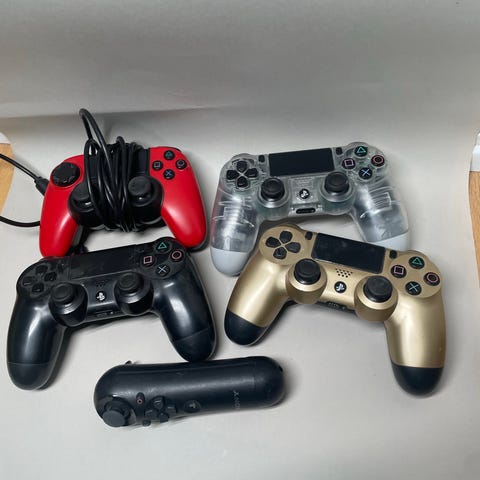 Defekte Sony PlayStation 4 DualShock 4 trådløs controller i sort og hvid farve.