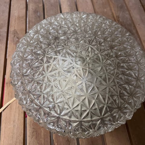 Skærmen er i klar glas med rosa og hvide nuancer samt guld-streger og måler 50cm i diameter.