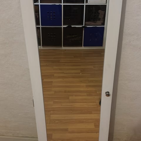 Skab 121x36x10 med spejllåge, indrettet med div smykkeopbevaring. Beregnet til ophæng.