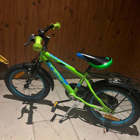 Bronco 16 tommer børnecykel i hvid farve. Cyklen har en stelstørrelse på 16 tommer og er designet til børn. Den er udstyret med bagagebærer og skærme foran og bagpå. Den har ingen gear. Vores dreng på 6 år er lige vokset fra den.