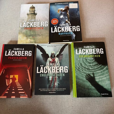 Camilla Läckberg bogpakke bestående af fem bøger: Ulykkesfuglen, Havfruen, Stenhuggeren, Prædikanten og Tyskerungen. Bøgerne er i hardcover format og varierer i tykkelse. Har været læst en gang.