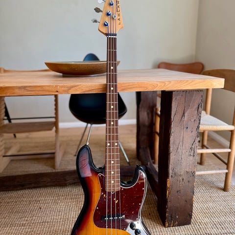 Lakland kvalitet, 5 strenget jazz med USA Bartolini HR-4.5/9 4 pot: 2 EQ (Bass, Treble) Pan og Volume OBP. Dual carbon rod I hals og monteret med 5 skruer, hipshot tunere, USA hånd spundne pickups. Denne bas er det bedste 5 strengede instrument med 34" hals (imponerende klar H streng), virkelig god preamp og helt egal hals. Den har et hak på kroppen desværre, det var en transport skade da jeg fik den tilsendt. Denne laves idag kun i USA model så den er lidt sjælden. I dag koster de tilsvarende 13-16.000 kroner.