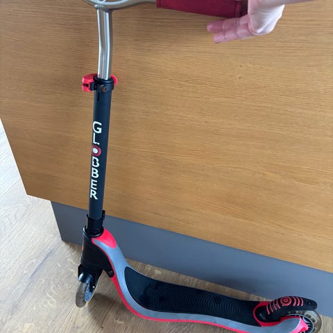 Globber løbehjul. Med to hjul foran, et bagved og bremse. Kan indstilles i højden på styret. Har altid stået indenfor i tørvejr, så er ikke rustet.