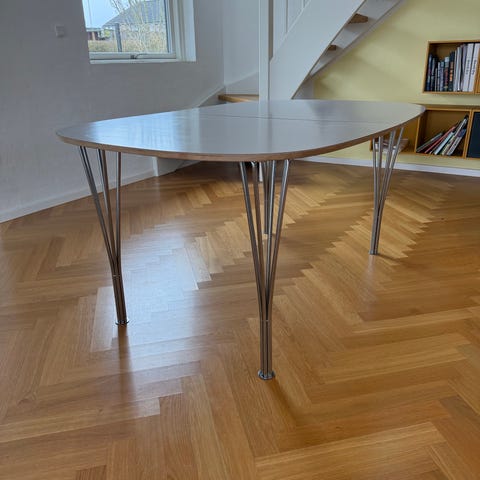 Der er 5-/6 siddepladser rundt om bordet iht om det skal stå frit eller op af væg.