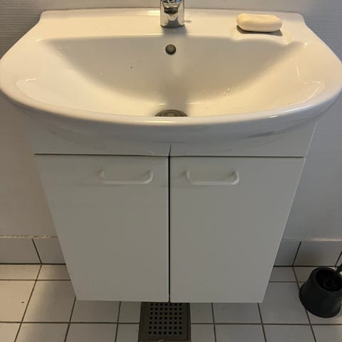 Badeværelsesskab til det lille badeværelse eller gæstetoilet i hvid med to låger og en vask monteret ovenpå. Mål er h70, b50, d30. Skabet har indvendige hylder til opbevaring. Vasken fra IFØ er udstyret med et Hans Grohe armatur med et greb til regulering af vandstrøm og temperatur. Fremstår pænt uden tydelige brugsspor.