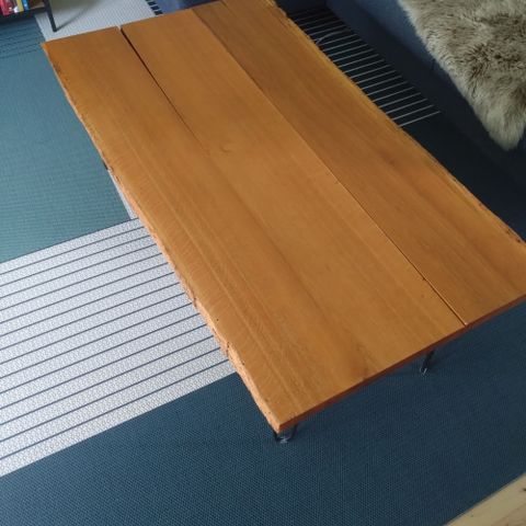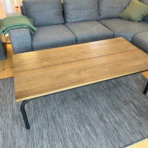 Flot aflangt planke sofabord med 2 egetræsplanker og pulverlakeret stel i sort. Med brugsmærker men i god stand. Fra ikke ryger hjem.