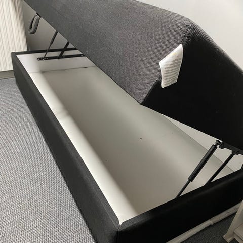Kender ik mærke men super fin grå seng med gode skuffer til opbevaring af legetøj og sengetøj