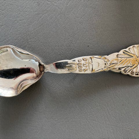 G. Jensen Jule Ske fra 1934 med julemotiv. Skeens materiale er sølv, og den har detaljer med en stjerne og en figur med barn. Skeens bagside er dekoreret med teksten 'JUL 1934' og stjerner.