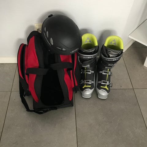 Støvler str 42-43 Salomon X Wave, Helle Hansen skidragt, snefang i liv, ærmer og ben bedste kvalitet , sort XL, hjelm Salomon str XL, skibriller. Skistrømper,, t-shirts samt vandtæt taske med plads til udstyret.