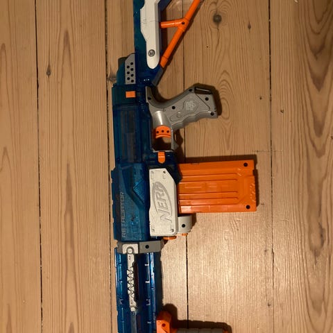 Nerf blaster med tromle magasin i farverne blå og orange. Legetøjsvåben designet til børn, med mulighed for hurtig affyring ved hjælp af det roterende tromle magasin.
