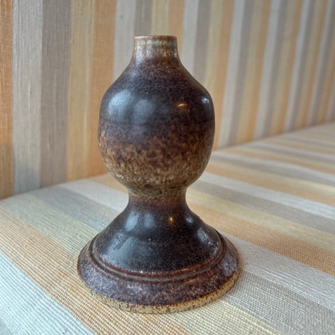 Fin vase i glaseret stentøj af keramiker Mark Stevens. Dekoreret med motiv af landskab og sol samt grå glasur. Vasen af I flot stand men har 2 glasurfejl langs fodrand hvor glasuren ikke dækker helt.