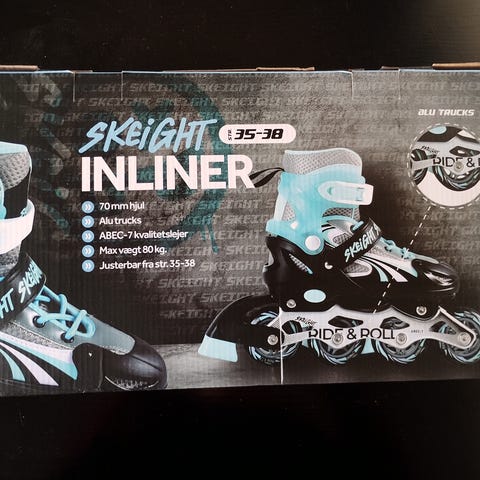 Justerbar inliners med lys i hjulene, som blinker, når de ruller. De er kun brugt en gang indenfor efter udpakning, men ellers aldrig anvendt. Derfor som nye. De er fra røgfrit hjem.