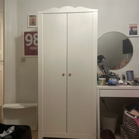 Fin klædeskab med hylder og bøjlestang og 2 trådkurve. Klistermærke 1 stk som fjernes inden