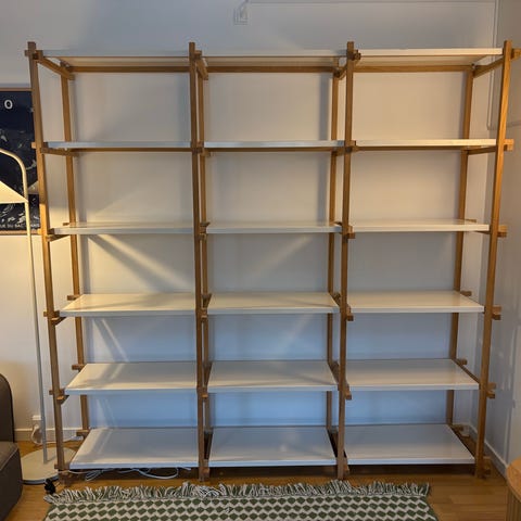 Hay reol med hylder i forskellige farver. Hylderne har brugsspor, men fremstår i fin stand.