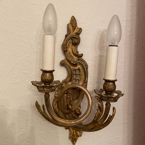 Antik væglampe i messing med tre arme til stearinlys. Lampen har dekorative detaljer og en klassisk stil, velegnet til vægmontering.