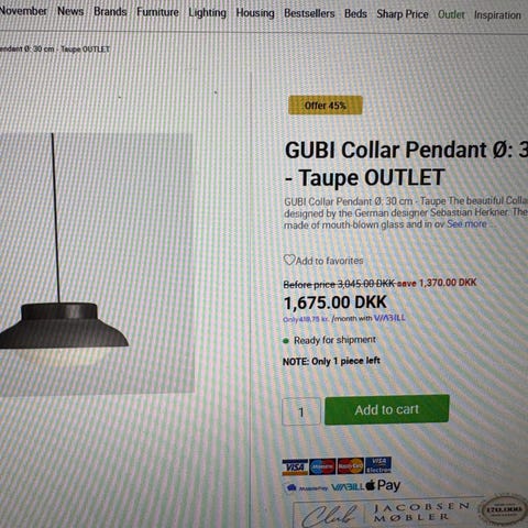 Helt ny GUBI COLLAR PENDANT (loftslampe) i indpakning og aldrig brugt. Lampen er grå/grøn (Stone Grey Soft Matt) med sort ledning.