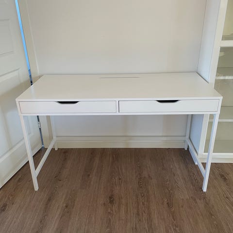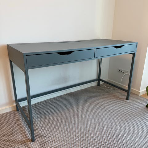 Langt skrivebord (319 x 60 cm) med 1 stk ALEX skuffeelement og 2 opbevaringsskabe med en hylde i hver.