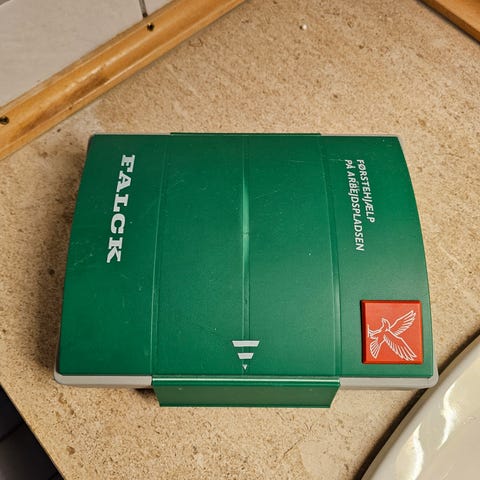Nød-Forbindingskasse i metal, rød farve. Førstehjælpskasse med opbevaringsrum til forbindinger og medicinsk udstyr. Designet til opbevaring af førstehjælpsmaterialer til nødbrug.