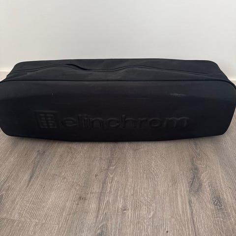 Elinchrom D-Lite RX One studiobelysning sæt med to lysenheder, stativ, reflektorer og bærepose. Sættet er velegnet til fotografering og studiebrug, designet til at give kontrolleret og kraftfuld belysning.