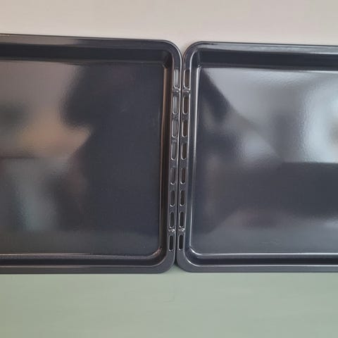 Bageplade/bradepande til varmluftovn i sort materiale. Egnet til brug i varmluftovne til bagning og madlavning. Jeg har én dyb bradepande og 3 af de "flade" som har tilhørt en Miele-ovn. Alle 4 er sparsomt brugt og fremstår virkelig fine.