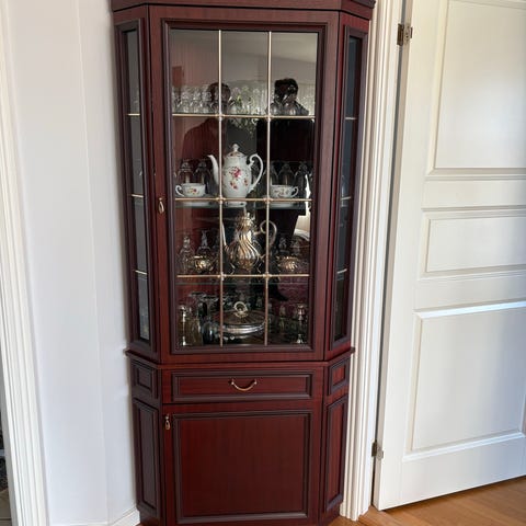 Hjørneskab i fineret nød eller maghoni