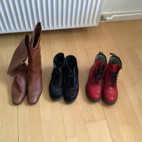 støvler i størrelse 37. Farven er sort med røde snørebånd. Støvlerne har en gummisål med mønster for bedre greb.Ukendt mærke