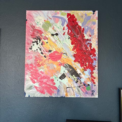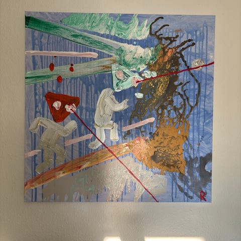 R - Abstrakt maleri på lærred bestående af to dele. Maleriet har en farvepalet med dominerende gule, grønne, lilla og brune nuancer. Motiverne er abstrakte figurer og former med forskellige teksturer og penselstrøg.