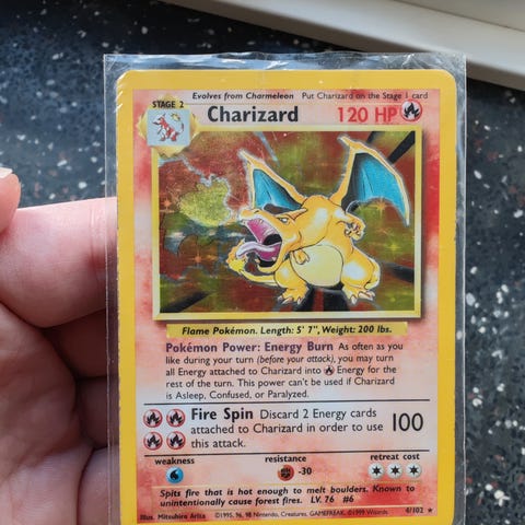Pokemon 1999 Shadowless samlekort med figurerne Charizard, Charmeleon og Charmander.