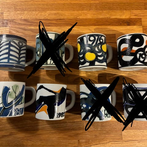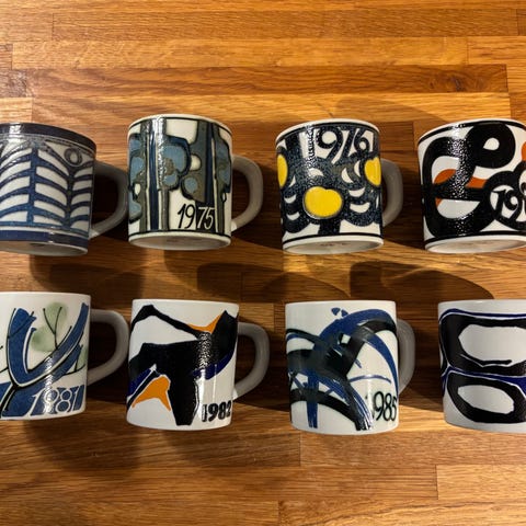 Royal Copenhagen Årskrus i porcelæn med forskellige årstal fra 1971 til 1976. Krusene har dekorative mønstre i farver som blå, sort og gul. Hvert krus har et håndmalet design, der markerer det specifikke år. Velegnet til samling eller brug som drikkekrus.