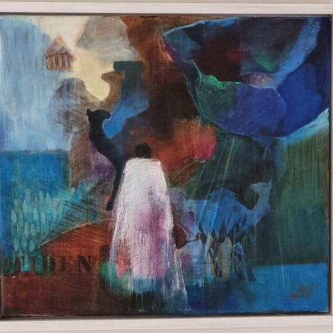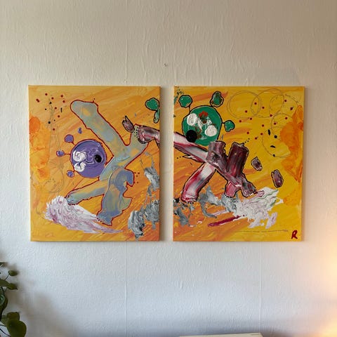 Abstrakt maleri på lærred med rød baggrund og farverige detaljer