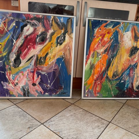 Maleri med motiv af en hest i grå nuancer mod en gul baggrund. Kunstværket fokuserer på hestens hoved og udtrykker detaljer i manken og ansigtet. Velegnet til dekoration.30*40