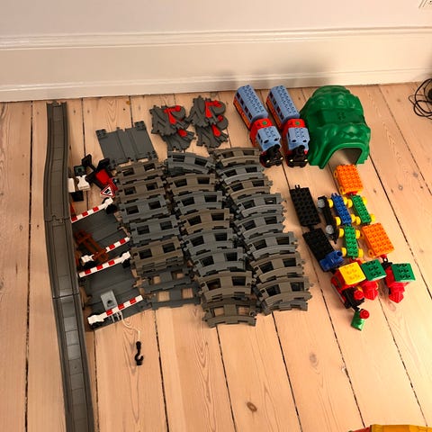 Komplet dublo togbane til mange timers leg. Spørg efter flere billeder da vi kun må lægge 5 billeder op. Der er 54 toge. 140 stk togbaner og et hav af broer, huse, grotter, stationer, fælder osv
