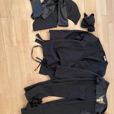 Unisex ninja kostume i sort og rød med hætte og tilbehør. Materialet er blødt og strækbart, egnet til udklædning eller temafester.