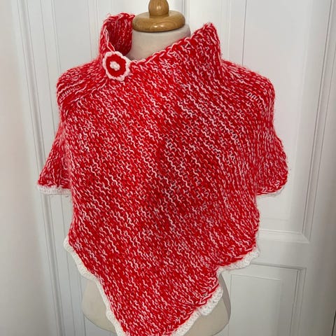 Strikket poncho i bouclé garn med palietter og frynser.