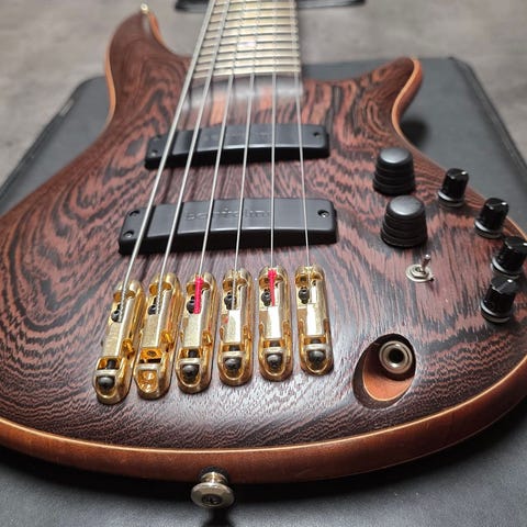 Maison 24 fretless PJ Bass handmade in Korea in the late 80s. Maison was known for its copies of popular guitars from Gibson and Jackson, with this bass clearly being a copy of an ESP Horizon bass given the logo next to the bottom of the fingerboard and the brand logo printed on the lower right of the pickups in outlined font just like ESP.