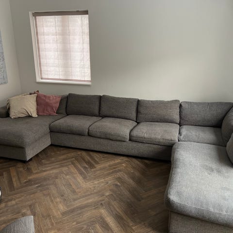 Vi sælger denne fantastiske store 6 personers sofa. Lysegrå uden pletter, har stået i røgfrit samt dyrefrit hjem. Den måler: Bredde: 330cm dybde:265cm.