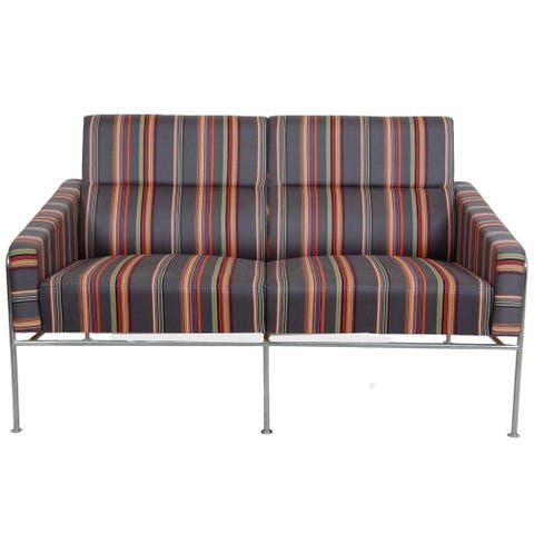 Arne Jacobsen. To-pers. sofa, model 3302 'Lufthavnssofa' med stel af grålakeret stål, betrukket med lyst uldstof.