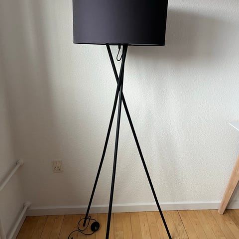 Lampen har en højde på cirka 175-180 cm (maks 185 cm) og skærm ø 38 cmi sort metal. Ledning med fodkontakt (80 cm -> fodkontakt -> 180 cm -> stik)