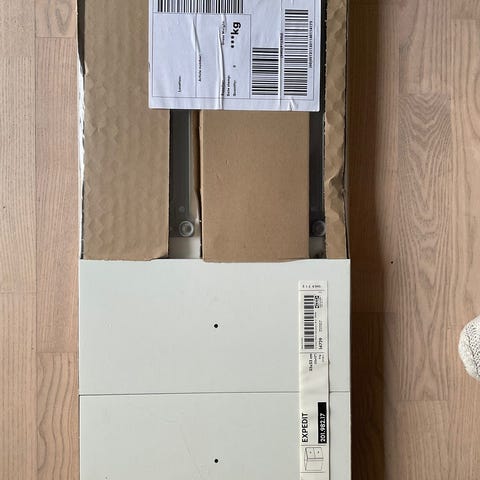 Der har været skruet ben på da den lå ned så der er huller under reolen.