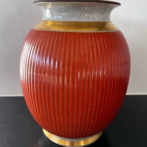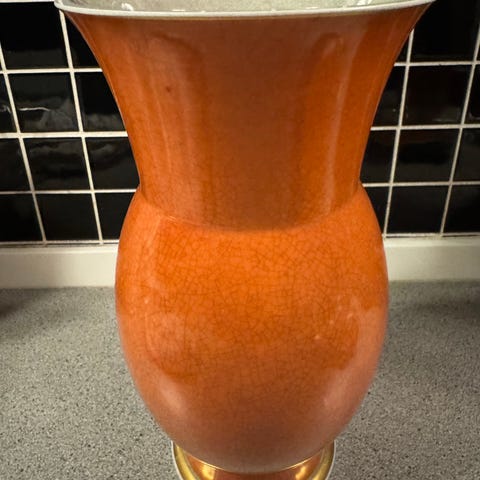 Royal Copenhagen vase i orange med guldkant. Vasen har en rund form med en smal hals og bredere bund. Den er dekoreret med en krakeleret glasur og detaljer i guld. Højden på væsen er 18 cm. Velegnet til blomsterdekoration eller som dekorativt element. se også mine andre annoncer med krakele porcelæn.