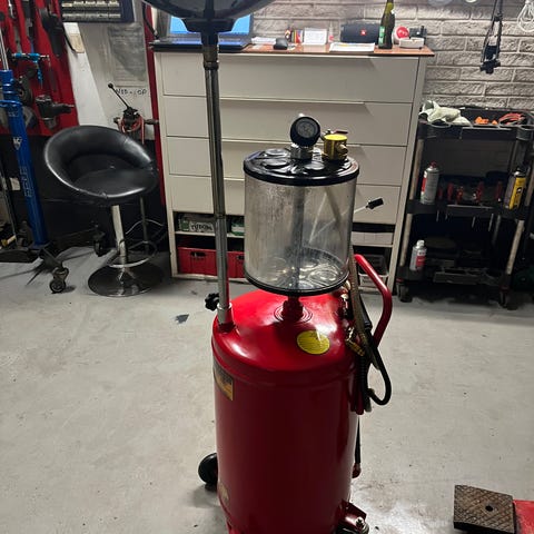 Beholderen er af en størrelse så du ikke skal tømme den efter hver olieskift og når den skal tømmes tilsluttes den blot luft og olien pumpes automatisk ud igen.