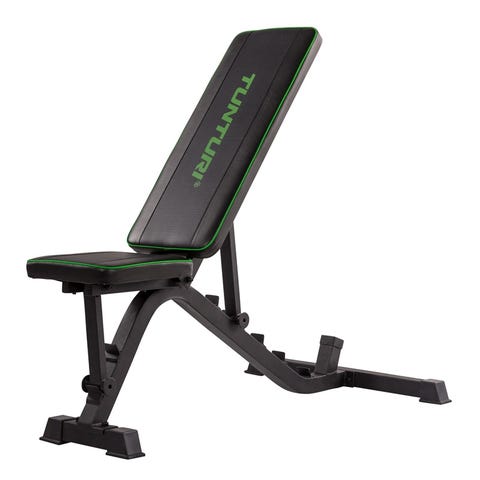 Tunturi træningsbænk i sort med grønne detaljer. Bænken har polstret overflade og metalstel, designet til styrketræning og fitnessøvelser.