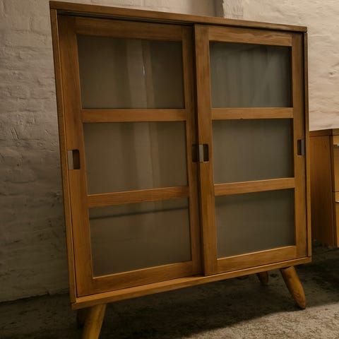 4 enkelt vitrineskabe med bundskabe. 3 hylder i glas delen, og en en hylde i bundskabet.