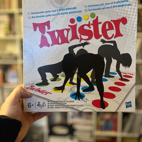 Hasbro Twister familiespil. Spillet indeholder en måtte med farvede cirkler og en drejeskive til at bestemme placeringen af hænder og fødder. Spillet er designet til børn fra 6 år og opefter og kan spilles af flere deltagere samtidig.