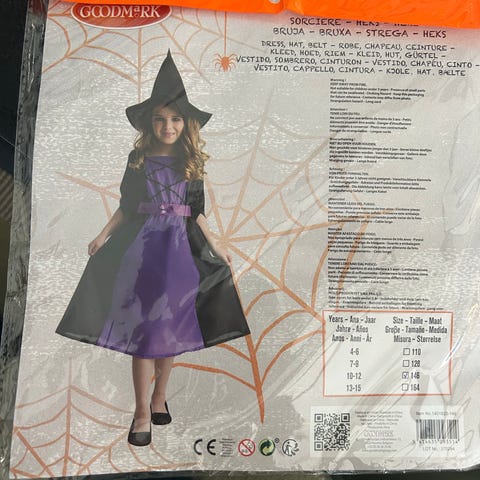 Unisex kjole i sort med lilla detaljer på skulder og talje. Kjolen har lange ærmer og en zigzag-kant nederst. Materialet er blødt og elastisk.
