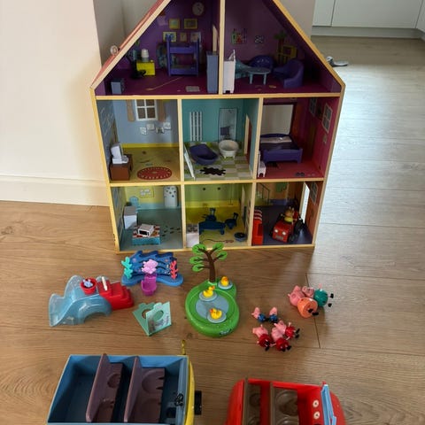 Fint dukkehus til gurli gris med møbler og figurer. Er lidt falmet af solen nogle steder, men ellers i rigtig fin stand.