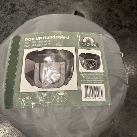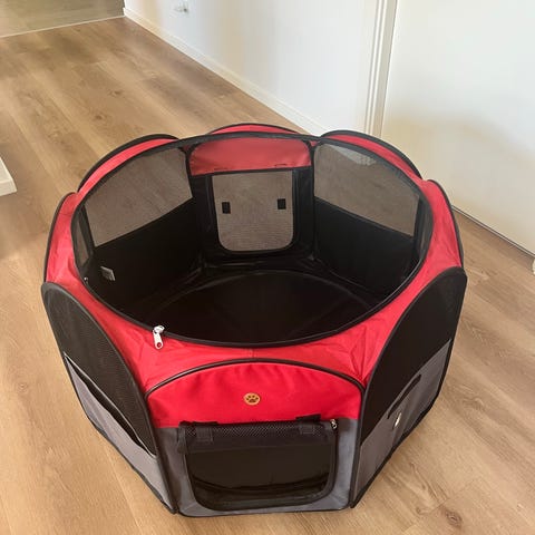Transportabel hunde- og katteindhegning i brun og beige med meshpaneler for ventilation. Indeholder en blød, lyserød pude. Velegnet til små kæledyr som hunde og katte for at skabe et afgrænset område. Kan pakkes sammen, så den fylder meget lidt.
